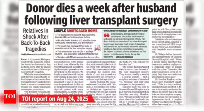 पुणे: आरोग्य उपसंचालक, पुणे सर्कल, डॉ. नागनाथ येमपले यांनी रविवारी यकृत प्रत्यारोपणानंतर कोआमकर जोडप्याच्या मृत्यूच्या कारणास्तव स्पष्टीकरण मिळविणार्या सह्याद्री रुग्णालयांना नोटीस पाठविली. प्रत्यारोपणाची आवश्यकता असलेल्या प्राप्तकर्त्याने केलेल्या आजारांबद्दलही त्यांनी अहवाल मागितला. या नोटीसला प्रतिसाद देण्यासाठी सोमवारी सकाळी 10 वाजेपर्यंत रुग्णालयात वेळ देण्यात आला आहे.हदापसर रहिवासी कामिनी कोआमकर (वय 42) यांनी तिच्या यकृताचा एक भाग पती बापू बाल्कृष्ण कोआमकर ())) यांना १ Aug ऑगस्ट रोजी दान केला. सह्याद्री रुग्णालयात शस्त्रक्रियेच्या काही तासांत त्यांचे निधन झाले. 22 ऑगस्ट रोजी तिचा मृत्यू झाला.आरोग्य अधिका -यांनी रुग्णालयाच्या यकृत प्रत्यारोपणाच्या परवान्याची वैधता आणि देणगीदार असलेल्या पत्नीवर केलेल्या अनुकूलता चाचण्यांचा तपशील विचारला आहे. खासगी रुग्णालयांमध्ये अवयव प्रत्यारोपणाच्या शस्त्रक्रिया करण्यासाठी पाच वर्षांचे परवाने आरोग्य उपसंचालक आरोग्य संचालकांच्या कार्यालयाने दिले आहेत. डॉ. येमपले म्हणाले, “उपसंचालक कार्यालयाने सर्व आवश्यकता तपासल्यानंतर रुग्णालयात थेट अवयव प्रत्यारोपणास परवानगी दिली आहे. थेट अवयवदानात, रुग्णालयाच्या इन-हाऊस ट्रान्सप्लांट समन्वय समितीला रक्तदात्या रक्तवाहिन्यासंबंधी किंवा जोडीदार असल्यास ते प्रत्यारोपणास मान्यता द्यावी लागते. नंतर ते बाहेरील अवयवदानाचे समिती आहे. वैद्यकीय दुर्लक्ष झाल्यास, पोलिसांना एफआयआर दाखल करावा लागतो ज्यानंतर निष्काळजीपणासाठी शासकीय समिती या प्रकरणात लक्ष देते. “एकमेकांच्या एका आठवड्यात दोन्ही मृत्यूमुळे वैद्यकीय बंधुत्वात खळबळ उडाली आहे. त्यांच्या नातेवाईकांनी अशी मागणी केली आहे की शस्त्रक्रिया आणि त्यानंतरच्या उपचारादरम्यान त्याच्याकडे दुर्लक्ष केल्याचा आरोप करून रुग्णालयाविरूद्ध खटला दाखल करावा. शनिवारी ससून जनरल हॉस्पिटलमध्ये शवविच्छेदन करण्यात आले आणि पोस्टमॉर्टमच्या अहवालाची प्रतीक्षा आहे. या जोडप्याच्या पश्चात त्यांचा 20 वर्षांचा मुलगा आणि 14 वर्षांची मुलगी आहे. प्रत्यारोपणाच्या खर्चासाठी त्यांनी त्यांचे घर तारण ठेवले होते. कोमकर हे एकमेव ब्रेडविनर होते, असे त्याच्या नातेवाईकांनी सांगितले.सह्याद्री रुग्णालयांच्या निवेदनात म्हटले आहे की त्यांना नोटीस मिळाली आहे. त्यात असे लिहिले आहे की, “सह्याद्री रुग्णालयांच्या वतीने या कठीण काळात कुटुंबाकडे आमची मनापासून शोक व्यक्त होत आहे. आम्हाला उपसंचालकांकडून नोटीस मिळाली आहे आणि तपासणीस आम्ही पूर्णपणे सहकार्य करीत आहोत. आम्ही या प्रकरणाचा सखोल आढावा घेण्यासाठी सर्व आवश्यक माहिती आण