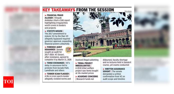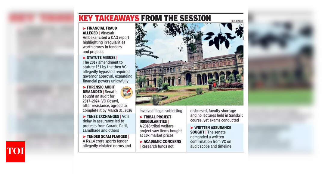 पुणे: मंगळवारी सावित्रिबाई फुले पुणे युनिव्हर्सिटी (एसपीपीयू) च्या सिनेटच्या बैठकीत कोटी रुपयांच्या आर्थिक फसवणूकीचा आणि भ्रष्टाचाराच्या आरोपांचे वादळ.संत डीएनएनेश्वर हॉलमधील सत्राच्या सुरुवातीच्या दिवसावर ज्वलंत एक्सचेंजचे वर्चस्व होते, सदस्यांनी विद्यापीठाच्या आर्थिक व्यवहारात ध्वजांकित केलेल्या अनियमिततेबद्दल उत्तरदायित्वाची मागणी केली.सिनेटचे सदस्य विनायक अंबेकर यांनी या आरोपाचे नेतृत्व केले आणि नियंत्रक आणि लेखापरीक्षक जनरल (सीएजी) च्या प्राथमिक अहवालाचा उल्लेख केला ज्याने एकाधिक खरेदी निविद आणि विद्यापीठ प्रकल्पांमधील मोठ्या प्रमाणात अनियमितता दर्शविली.“मूळ कायद्यात १1१ मध्ये कुलगुरू (कुलगुरू) यांना दिलेला हक्क rs०,००० रुपये आणि भांडवली खर्चासाठी २,000,००० रुपयांपर्यंतचा आहे. २०१ 2017 मध्ये तत्कालीन व्हीसीने सुधारित खर्चाची मर्यादा १२,50०,००० रुपये आणि भांडवली खर्च २5 एलएकेएच पर्यंत वाढविली. दुरुस्ती अंतर्गत पाच वर्षांत त्याने केलेले सर्व व्यवहार बेकायदेशीर आहेत. स्वार्थी हेतूंसाठी त्यांनी 151 च्या कायद्याचे उल्लंघन केले. हे कुलपतींना कळवावे, ”अंबेकर म्हणाले.ते पुढे म्हणाले की, महाराष्ट्र युनिव्हर्सिटीज अ‍ॅक्टने क्षुल्लक परिस्थितीत तात्पुरती दुरुस्ती करण्यास परवानगी दिली आहे, परंतु असे बदल राज्यपालांनी सहा महिन्यांत मंजूर केले पाहिजेत – एक पाऊल कधीही घेतले नाही. अंबेकर यांच्या म्हणण्यानुसार, लुप्तीने कुलगुरू अनियंत्रित आर्थिक अधिकार दिला, ज्यामुळे कथित गैरवापर झाला. सिनेटने विद्यापीठाच्या संपूर्ण आर्थिक ऑडिटची मागणी केली.सध्याचे कुलगुरू सुरेश गोसावी यांनी सुरुवातीला प्रतिकार केला आणि त्वरित चौकशीचे वचन देण्यास नकार दिला. यामुळे सचिन गोराडे पाटील, शंतानू लामधादे आणि दादाभौ शिनकर यांच्यासह सदस्यांचा जोरदार निषेध झाला. नंतर, गोसावीने प्राथमिक चौकशीसाठी तज्ञ समिती नेमण्यास सहमती दर्शविली जी फॉरेन्सिक ऑडिटची आवश्यकता आहे की नाही हे ठरवेल. तथापि, हे अंबेकर आणि इतरांनी द्रुतपणे नाकारले.वाढत्या दबावाच्या दरम्यान गोसावीला पुन्हा धोक्यात घालवायचे होते. ते म्हणाले, “विद्यापीठाच्या वित्तपुरवठ्याचे फॉरेन्सिक ऑडिट 31 मार्च 2026 पूर्वी आयोजित केले जाईल आणि सादर केले जाईल,” ते म्हणाले.२०१ to ते २०२ from या कालावधीत ऑडिटमध्ये आर्थिक वर्षांचा समावेश असल्याचे सिनेटने लेखी आश्वासन मागितले. गोसवी म्हणाले की, बैठकीच्या मिनिटांची औपचारिक नोंद झाल्यानंतर या पत्राची एक प्रत अंबेकरला देण्यात येईल, ज्यामुळे अधिवेशनाच्या पहिल्या दिवसाचा निष्कर्ष आहे.बैठकीच्या सुरूवातीपासूनच तणाव दिसून आला, ज्याने विद्यापीठाच्या घटत्या एनआयआरएफ 