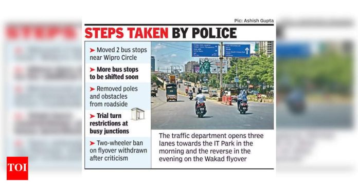 पुणे: प्रवाशांनी हिंजवाडी आयटी पार्कच्या आसपास गर्दी कमी करण्यासाठी त्वरित दीर्घकालीन योजनांची मागणी केली आहे आणि असे सांगितले की गेल्या महिन्यात ठेवण्यात आलेल्या अनेक उपाययोजनांमध्ये मोठ्या प्रमाणात कुचकामी ठरली आहे, जरी रहदारी पोलिसांनी जमिनीवर सुधारणा केल्याचा दावा केला गेला.गेल्या महिन्यात, वाहतूक विभागाने चार-लेन वाकाड उड्डाणपुलावर पीक तासांमध्ये सल्लागार सुधारित वाहनांच्या हालचाली जारी केल्या. नवीन व्यवस्थेमुळे भुजबल चौक येथून सकाळी and ते ११ वाजता आयटी पार्कच्या दिशेने जाणा vehicles ्या वाहनांना तीन लेन उघडले आणि उलट दिशेने प्रवास करणा those ्यांसाठी फक्त एक लेन सोडली. संध्याकाळी संध्याकाळी and ते संध्याकाळी between दरम्यान, आयटी पार्क ते भुजबल चौकाच्या दिशेने जाणा those ्यांसाठी आणि उलट दिशेने प्रवास करणार्यांसाठी तीन लेन उपलब्ध आहेत.पोलिसांचे पोलिस आयुक्त (ट्रॅफिक) विवेक पाटील म्हणाले की, विप्रो सर्कलजवळील दोन पीएमपीएमएल बस स्टॉप वाहनांना अडथळा आणत आहेत आणि त्यांना पुनर्स्थित करण्यात आले आहे, तर भुजबल चौक जवळ आणखी दोन जण लवकरच हलविण्यात येतील. ते म्हणाले, “गेल्या काही दिवसांपासून अनेक वीज खांब आणि रस्त्याच्या कडेला असलेल्या इतर संरचनेसुद्धा काढून टाकण्यात आल्या आहेत. उपक्रमांनी काही प्रमाणात गर्दी कमी केली आहे,” ते म्हणाले.पाटील पुढे म्हणाले की, ट्रॅफिक पोलिसांनी चाचणीच्या आधारावर काही अडचणींवर वळण मर्यादित केले होते आणि आयटी पार्कच्या सभोवतालची गर्दी कमी करण्यासाठी इतर ठिकाणी समान उपाययोजना लागू केल्या जातील. दुचाकी चालकांना वाकाड फ्लायओव्हरमध्ये प्रवेश करण्यापासून रोखण्याचा पूर्वीचा निर्णय टीकेनंतर मागे घेण्यात आला होता.दैनंदिन प्रवाशांनी सांगितले की बदल तात्पुरते दिलासा मिळाला.नियमित प्रवासी पुषप्राज निम्बालकर म्हणाले, “वाकाड उड्डाणपुलांच्या अरुंद प्रवेश आणि एक्झिट पॉईंट्सने उपाययोजनांचा परिणाम भरून काढला आहे. अधिका authorities ्यांनी दीर्घकालीन समाधानासाठी आयटी पार्कच्या सभोवतालच्या सर्व रस्त्यांची रुंदी वाढविली पाहिजे.”वाकाड येथील दत्ता मंदिर रोडचे अभिषेक पद्मवार, जे नियमितपणे हिंजवाडी फेज तिसरा येथे जातात, ते म्हणाले, “वाकाड उड्डाणपूल ओलांडण्यास 20 मिनिटे लागतात कारण अॅप्रोचचे रस्ते विस्तृत आहेत आणि प्रवेश आणि निर्गमन बिंदू अरुंद आहेत. परिस्थिती हाताळण्यासाठी पोलिसांनी रस्त्यावर तैनात असलेल्या वाहतुकीच्या कर्मचार्यांची संख्या वाढवावी. “आयटी कर्मचार्यांच्या फोरमचे पवनजित माने यांनी उपमुख्यमंत्री अजित पवार यांना लिहिले आहे. ते म्हणाले की दोन महिन्यांपूर्वी झालेल्या बैठकीत चर्चा झालेल्या अनेक महत्त्वाच्या म